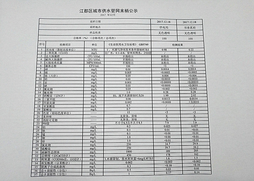 2017年12月江都區城市供水管網末梢公示