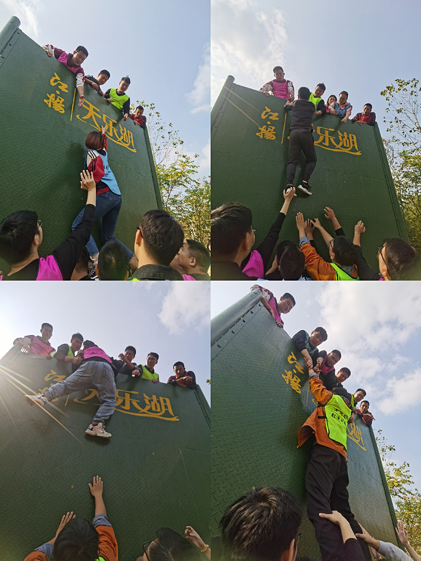 圖為團(tuán)員青年齊心合力翻越 “畢業(yè)墻”