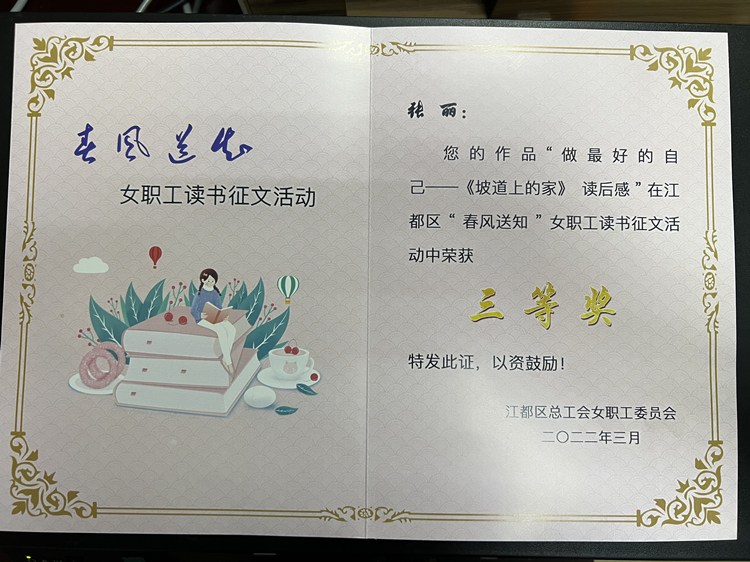 為全面提升員工綜合素質,倡導終身學習理念,豐富精神生活,引領職業女性愛上閱讀,培養閱讀習慣,在閱讀中獲得幸福感,激勵女職工立足崗位,以最美的奮斗姿態砥礪前行。為此龍川水務公司除在內部多形式的開展讀書比賽和讀書分享會等相關活動之外,還積極響應上級讀書征文活動號召,鼓勵大家踴躍投稿參賽。日前,在揚州市江都區總工會開展的“春風送知”女職工讀書征文活動中,由龍川水務公司選送的人力資源部張麗的參賽作品“做最好的自己—《坡道上的家》讀后感”獲得了三等獎。