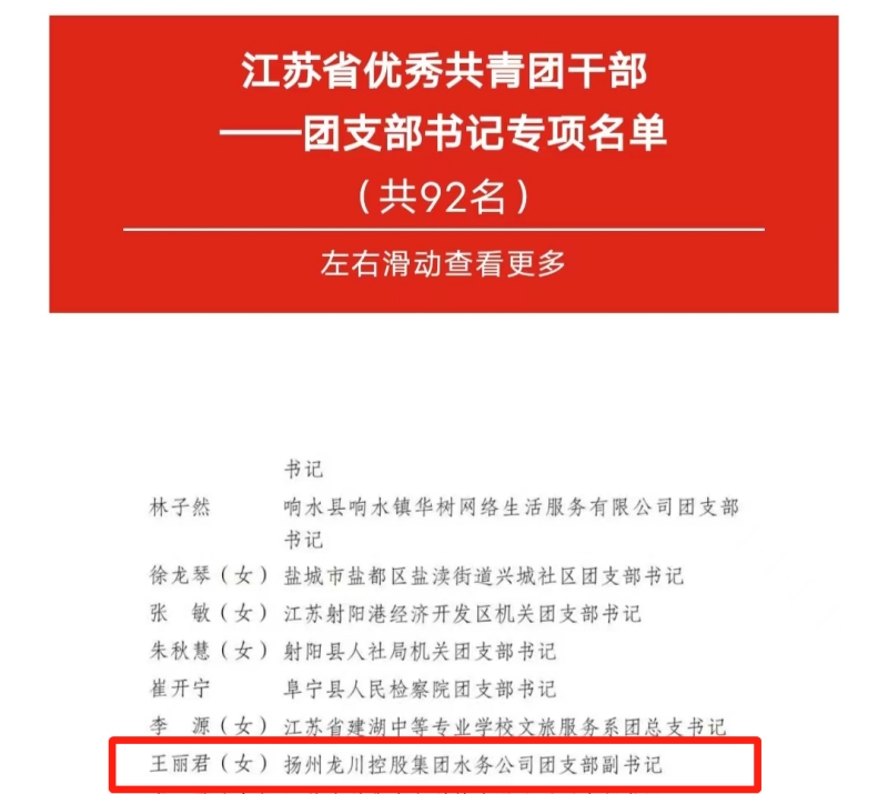 喜報 │龍川水務職工王麗君榮獲江蘇省“優秀共青團干部(團支部書記專項)”稱號