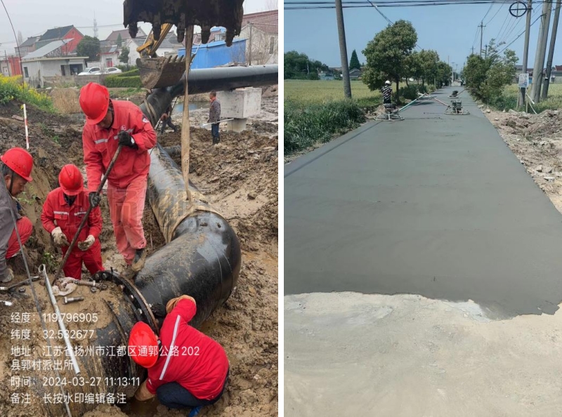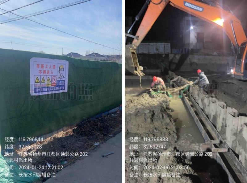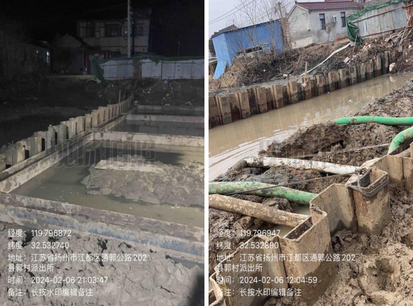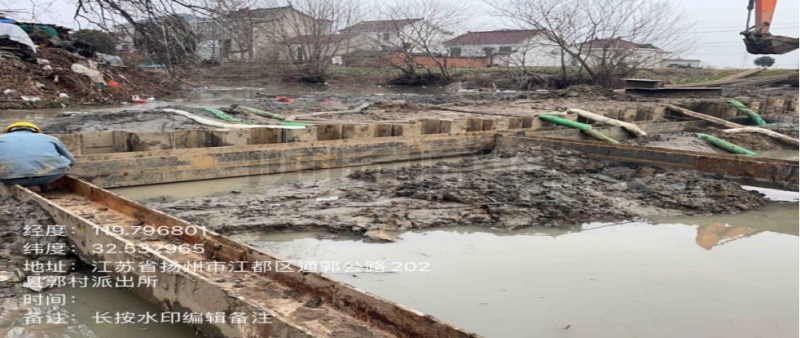 在施工過程中,東側(cè)原造橋壩頭設(shè)置過高,上游自來水漏水嚴重,挖機無法進場施工,人工拆除兩道壩頭。施工總體步驟:草袋圍堰支護,支護內(nèi)明排水,靜壓打樁,圍堰施工,開挖,管道維修,管道打壓,回填,鋼板樁拆除,圍堰拆除。