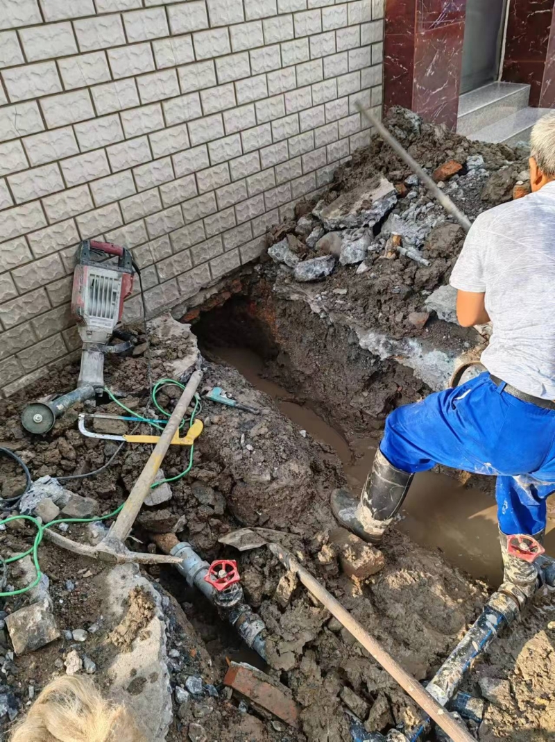 近期玉帶公寓用戶反映21幢、22幢高層無水可用,接到用戶報修后,自來水公司管網辦副主任王曉靜同志與龍泉建設工程公司維修部主任李兆軍同志帶領維修人員,第一時間趕到現場,為居民解決用水問題,經現場查勘發現:玉帶公寓(前身為公檢法大院)內部供水管道多年前安裝,自來水管道布局較為復雜,漏點又在房屋內部,維修難度較大。維修人員利用尋管儀巡查,在巡查過程中因干擾太多無法確定漏點上游管道,后經管網辦與龍泉公司工作人員現場拿方案,最終決定采取在墻體外側開挖,切除管道的辦法對漏點進行維修。