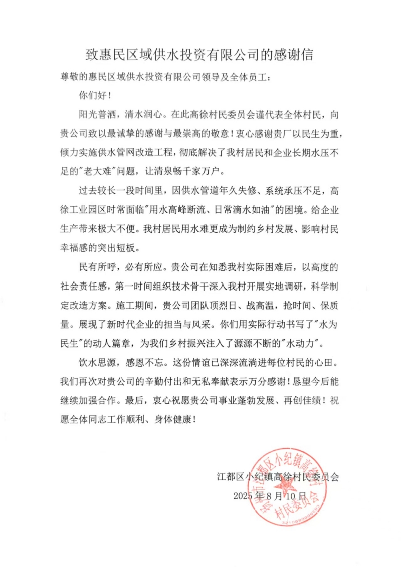 高徐村民委員會在感謝信中寫道:“施工期間,貴公司團(tuán)隊(duì)頂烈日、戰(zhàn)高溫,搶時(shí)間、保質(zhì)量。展現(xiàn)了新時(shí)代企業(yè)的擔(dān)當(dāng)與風(fēng)采。你們用實(shí)際行動書寫了水為民生的動人篇章,為我們鄉(xiāng)村振興注入了源源不斷的水動力。”